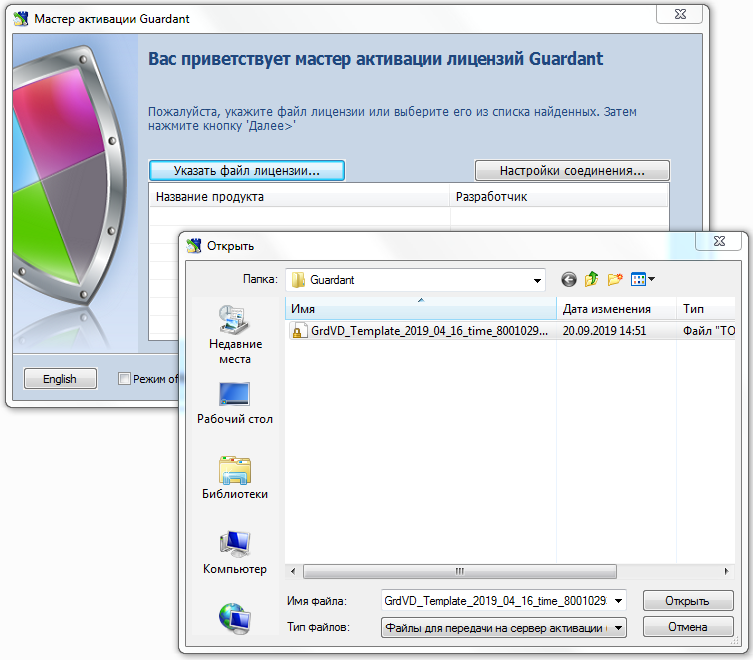 4. Этот файл перенесите на компьютер, где есть доступ в интернет, запустите Мастер активации (GuardantActivationWizard.exe), нажмите кнопку "Указать файл лицензии…" и в выпадающем списке окна навигации укажите в поле "Тип файлов:" параметр "Файлы для передачи на сервер активации (*toserver)":