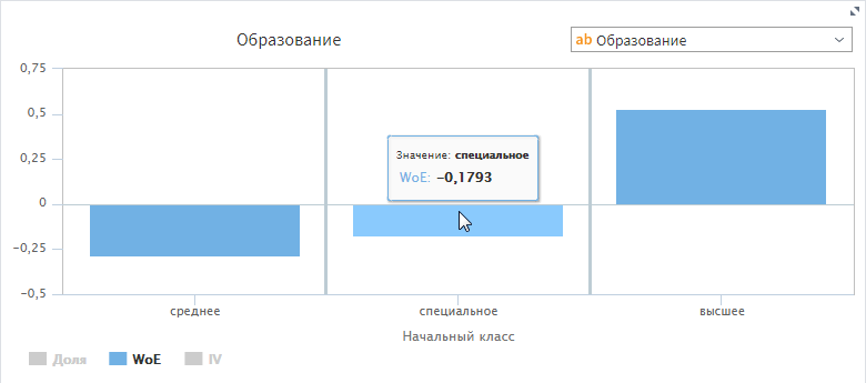 При наведении на столбец диаграммы появляется всплывающее окно, которое отображает значение поля и значение WoE/IV/Доли (см. рисунок 3).