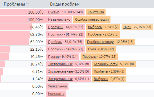 Рядом со значением Вида проблем указывается количество строк с такой проблемой, в скобках указывается процентное соотношение проблемных строк к общему количеству строк.